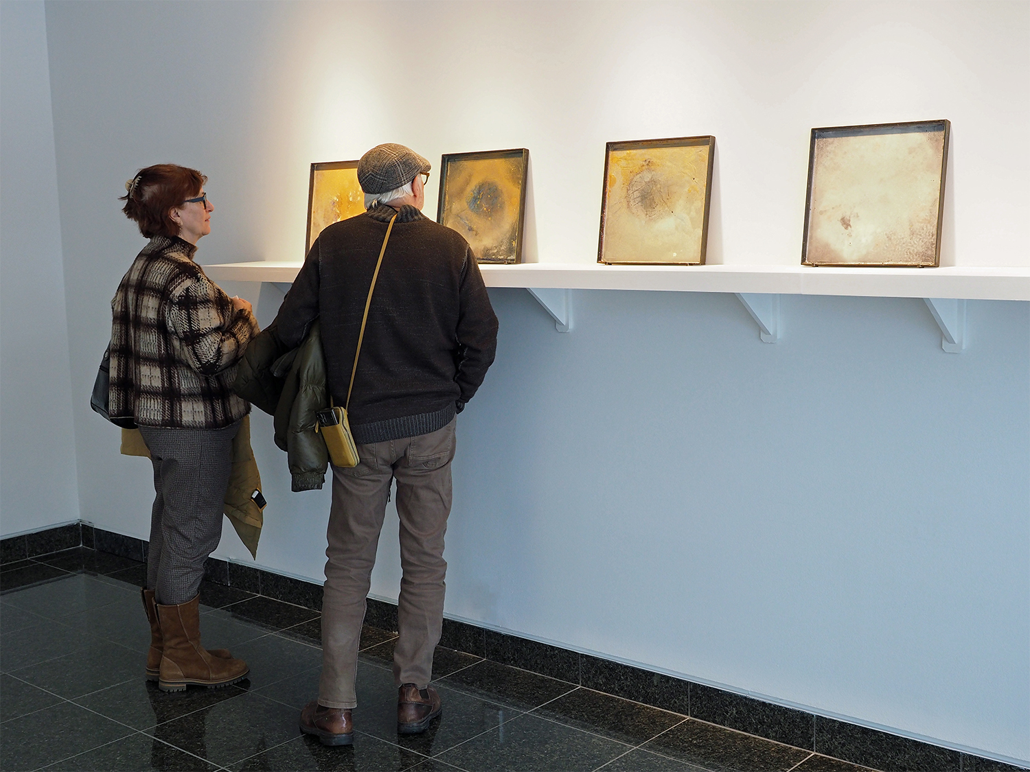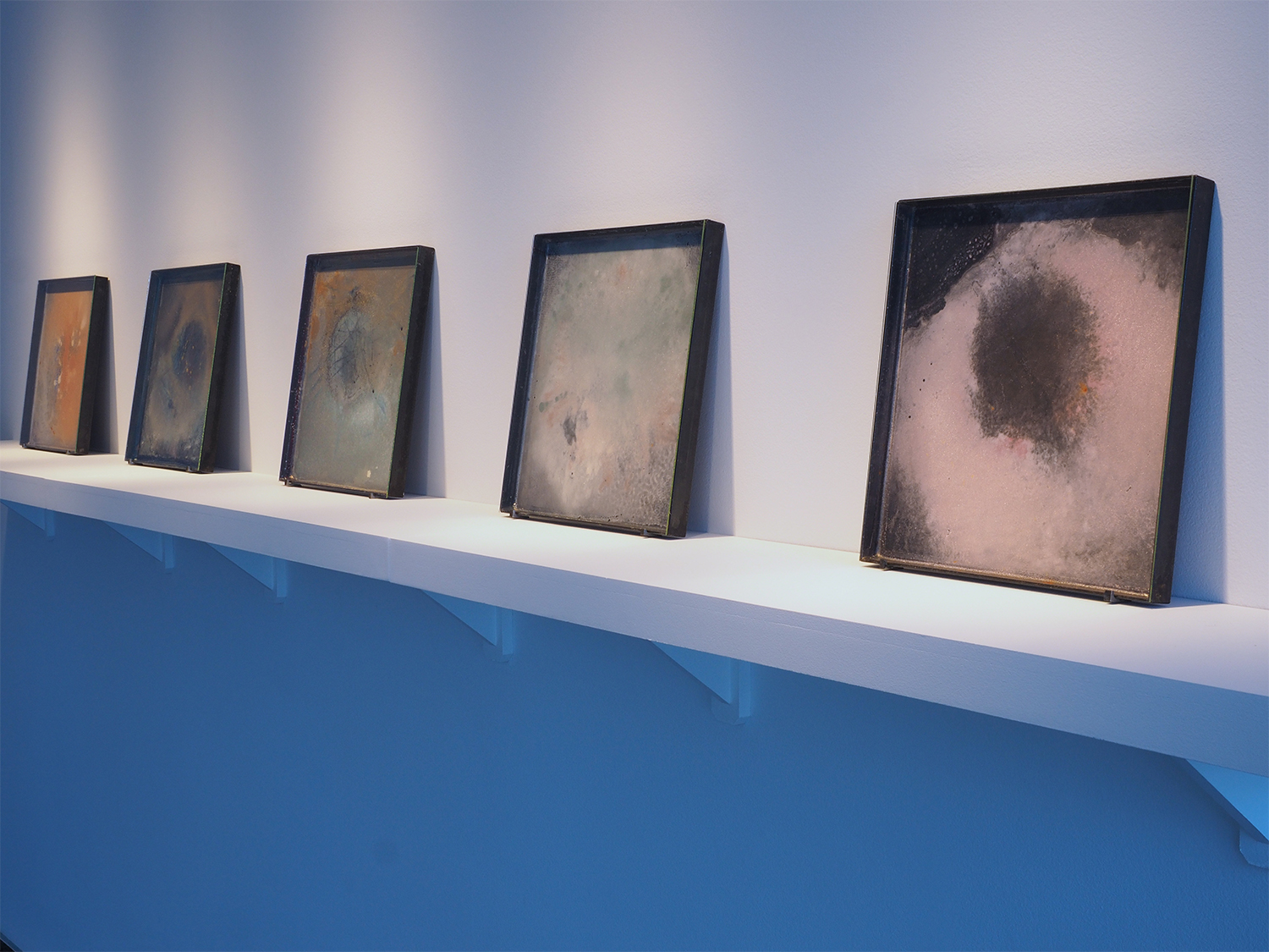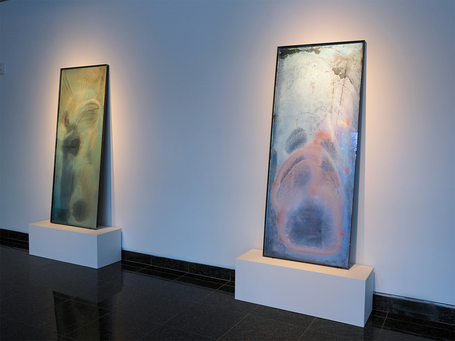 Dans cette exposition, Sandra Volny présente les sons inaudibles des sols de glace de l’Antarctique et des déserts de sable du Nouveau-Mexique. Connectant l’art à la recherche scientifique, l’artiste a développé un procédé qui lui permet de révéler et d’archiver la voix de la glace sur le métal. Les vibrations enregistrées par les sismographes sont rendues audibles grâce aux algorithmes du mathématicien et géophysicien Julien Chaput. Puis, elles sont projetées pendant près d’un mois sur des pigments en suspension dans l’eau. L’eau s’évapore lentement, les pigments se sédimentent au fond des grands bacs d’acier et des “fossiles” sonores apparaissent. Tout un univers sonore se révèle ainsi sous la forme de sons cristallisés.