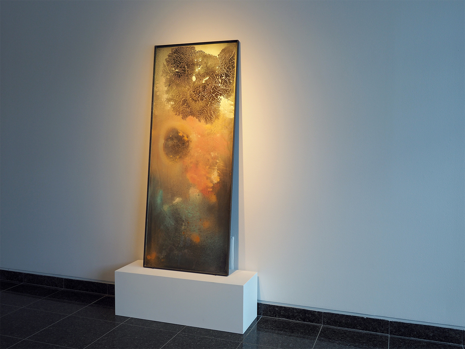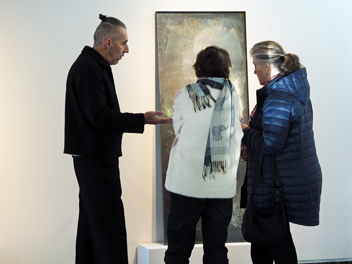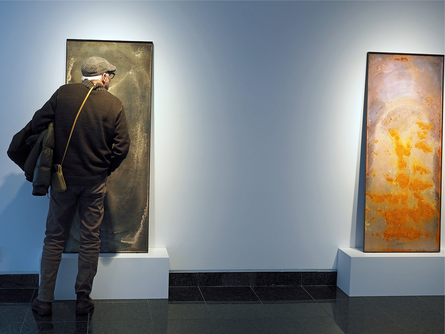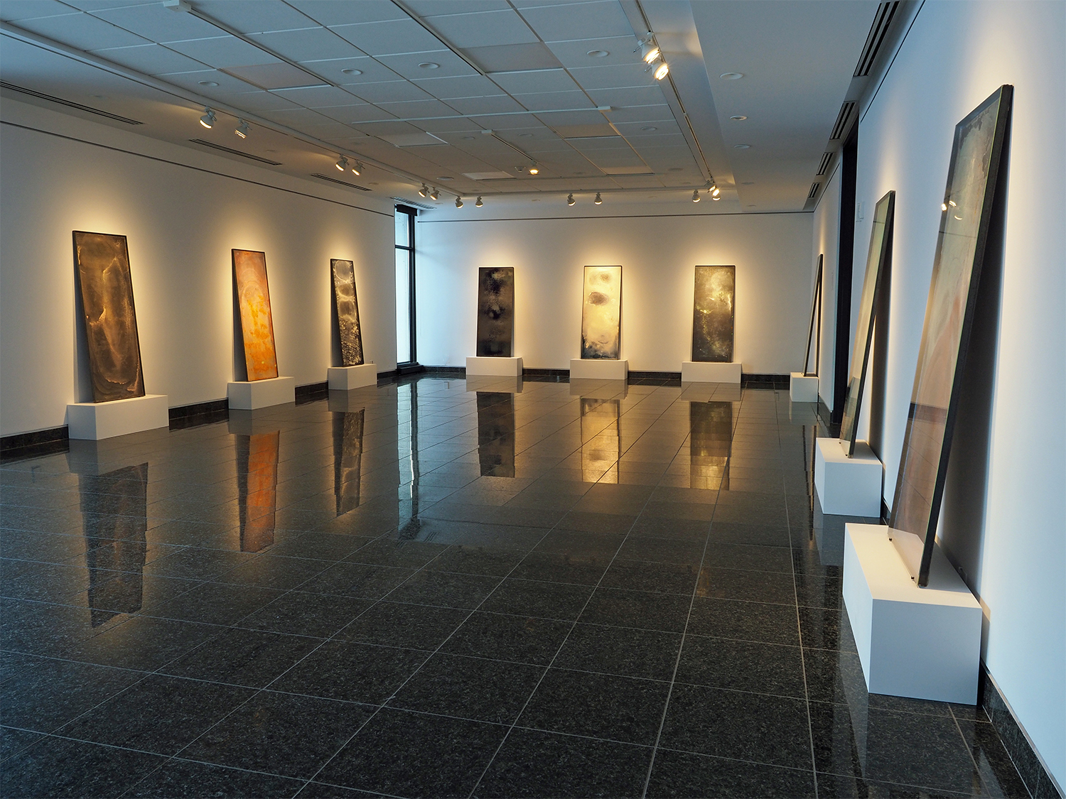 Dans cette exposition, Sandra Volny présente les sons inaudibles des sols de glace de l’Antarctique et des déserts de sable du Nouveau-Mexique. Connectant l’art à la recherche scientifique, l’artiste a développé un procédé qui lui permet de révéler et d’archiver la voix de la glace sur le métal. Les vibrations enregistrées par les sismographes sont rendues audibles grâce aux algorithmes du mathématicien et géophysicien Julien Chaput. Puis, elles sont projetées pendant près d’un mois sur des pigments en suspension dans l’eau. L’eau s’évapore lentement, les pigments se sédimentent au fond des grands bacs d’acier et des “fossiles” sonores apparaissent. Tout un univers sonore se révèle ainsi sous la forme de sons cristallisés.